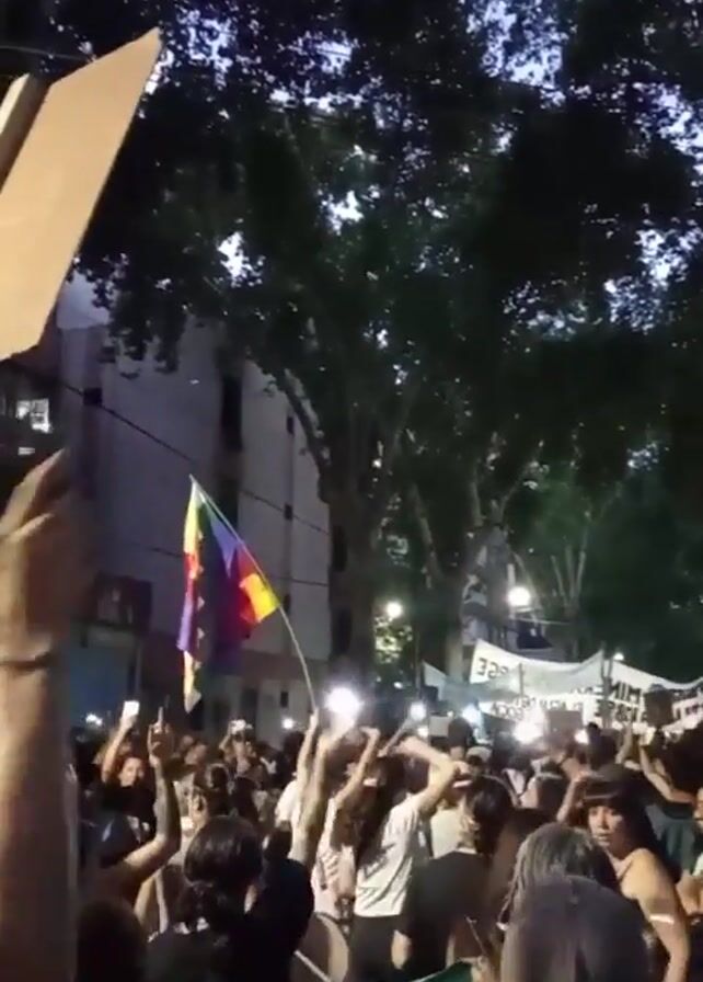 large crowd of people marching. Many are holding signs, cell phones, and a flag with a rainbow pattern. The march appears to be taking place in a city street lined with trees. The lighting suggests it is dusk or evening. The crowd seems to be moving towards the camera. People are raising their arms and chanting. The overall atmosphere seems to be one of protest or demonstration.