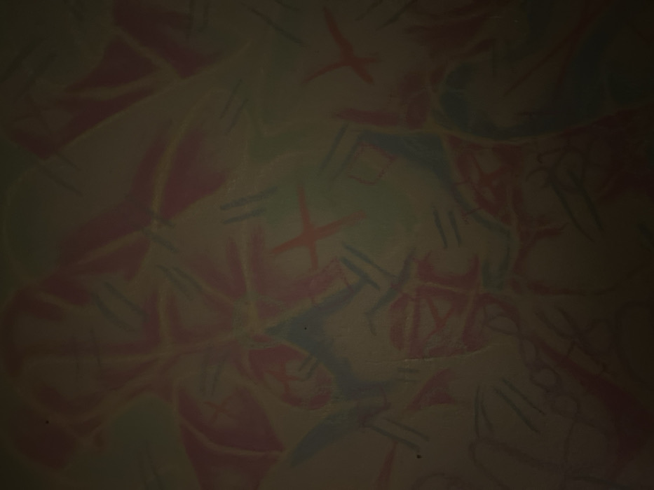 The image presents an abstract composition with a blend of geometric and organic shapes. Dominant colors include muted tones of red, blue, and green. Short, dark lines are scattered throughout, overlaying larger, undefined forms. The artwork appears textured, with a faded or aged quality. The overall impression is one of a layered, chaotic design with a sense of depth.