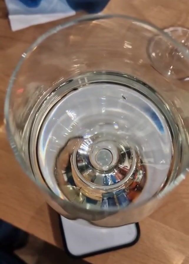 wine glass filled with clear liquid sitting on top of a phone. The glass is large, with a wide bowl and a narrow stem. The liquid appears to be water or white wine. Bubbles form and dissolve in the water, and the light reflections off the glass create patterns. The phone underneath the glass is white and black with multiple camera lenses on its back. The table is made of light brown wood. In the background, there are two blue glasses. The video's angle is from above, looking down into the glass.