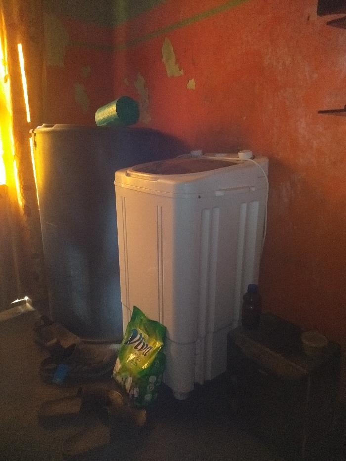This interior scene, located in Sabon Gari East, Nigeria, depicts a utilitarian room characterized by distressed orange walls with visible patches of peeled paint exposing a lighter green undercoat and partial green horizontal stripes. A strong yellow light emanates from a window on the far left, illuminating the left side of the room and casting shadows. In the foreground, on the dark floor, several pairs of miscellaneous sandals are scattered. A large, dark grey cylindrical plastic water storage barrel with a closed lid stands prominently on the left, partially within the window's light. A green cylindrical object rests horizontally on top of this barrel. To the right of the barrel, a white, compact twin-tub washing machine is positioned, featuring vertical ridges on its front panel, a brown-tinted transparent lid, and two white control knobs on its upper surface. Leaning against the base of the washing machine is a bright green and yellow plastic pouch of "Diva" washing powder. To the far right, a low, dark wooden table or stool holds a small dark brown plastic bottle with a cap and a light-colored, shallow bowl. Faint outlines of shelves are discernible against the upper right wall. No individuals are present in the scene.