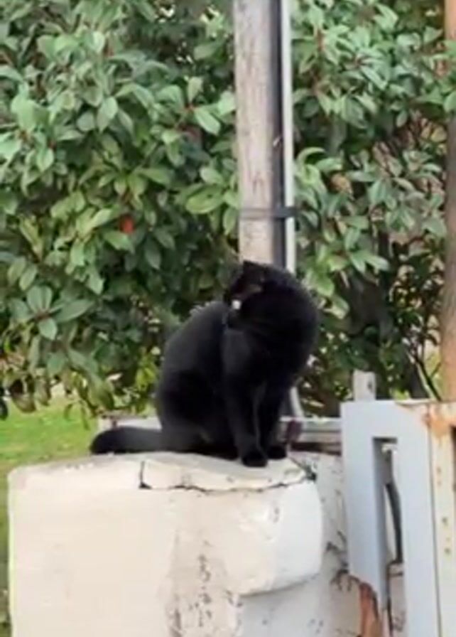 A black cat sits on a white, weathered concrete structure. Behind it are green bushes, a grey utility pole with black wiring, and a partially visible metal structure to the right. A metallic sound is heard.