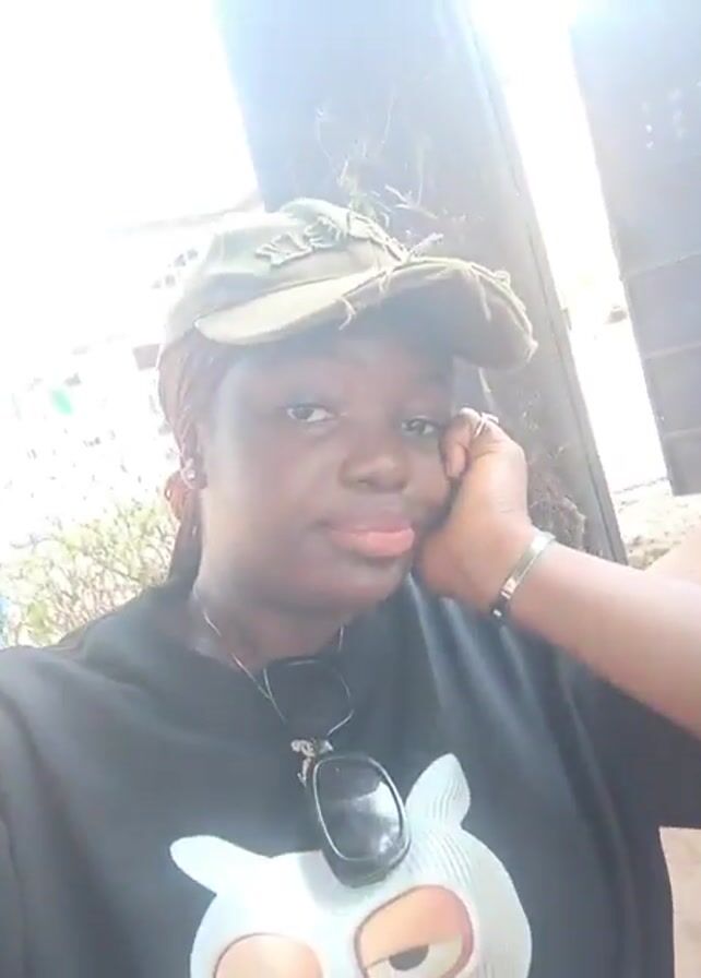 A woman is taking a selfie. She is wearing a black shirt with a white graphic, a tattered green baseball cap, and sunglasses hanging on a chain around her neck. She has dark skin and is wearing a silver ring and bracelet. She is leaning her head on her hand and looking at the camera with a pursed-lip expression. Behind her is a chain-link fence, some greenery, and a blurry view of a building. People are walking in the background. There is sunlight.