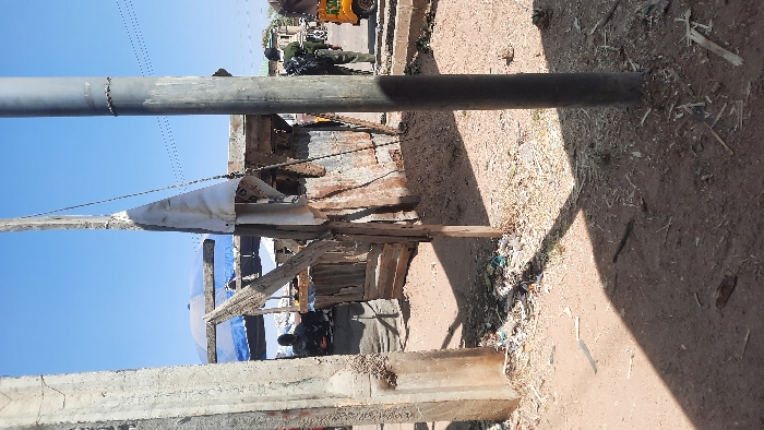 The scene depicts an outdoor roadside area in Panshekara, Nigeria, under a clear blue sky. In the immediate foreground, the ground is unpaved, consisting of reddish-brown dirt littered with wood shavings and miscellaneous debris. From left to right, the mid-ground features a thick, weathered concrete pillar on the left. To its right, a slender, unpainted wooden pole stands upright, with a piece of white fabric, possibly a tattered banner, tied and hanging from it. Behind this pole, a crudely constructed stall or shelter is visible, made from wooden planks and rusty corrugated metal sheets. A blue market umbrella provides shade over this structure. In the background, behind the stall, a person is seated or crouched, partially obscured by the structure and umbrella. Further to the right, a male individual is walking away from the viewer, wearing dark trousers, a green long-sleeved top, and a black backpack. Adjacent to him, on what appears to be a paved road or pathway, a yellow auto-rickshaw (Keke NAPEP) is partially visible. To the far right, a grey metal utility pole stands, showing signs of wear. Distant buildings with light-colored walls and dark roofs are visible under the bright sunlight. Shadows of the foreground poles extend across the unpaved ground.