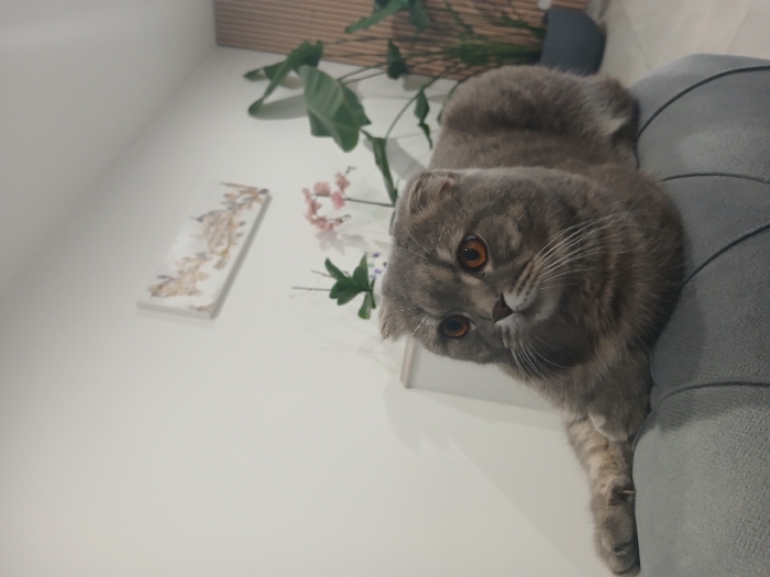 - "A blue-grey Scottish Fold cat with amber eyes is situated in the foreground, resting on a light grey upholstered furniture piece" by FM-GqrYX2, licensed under CC BY 4.0