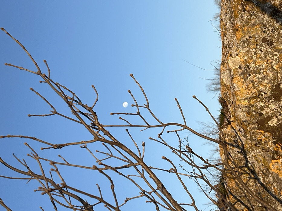 The image captures a natural outdoor scene in Provadia, Bulgaria. In the foreground, a large, textured rock formation, primarily gray, is visible across the bottom and right, extensively covered with bright yellow and white lichens. Above and to the left, a network of bare, brown tree branches extends across the left half of the frame. These branches are detailed with numerous small, undeveloped buds, consistent with a late winter or early spring environment. The upper background features a clear, light blue sky. A distinct, white, gibbous moon is visible in the upper-right portion of the sky, partially framed by the tree branches. No human subjects, animals, or explicit actions are depicted. The scene is illuminated by natural light, indicating daytime.
