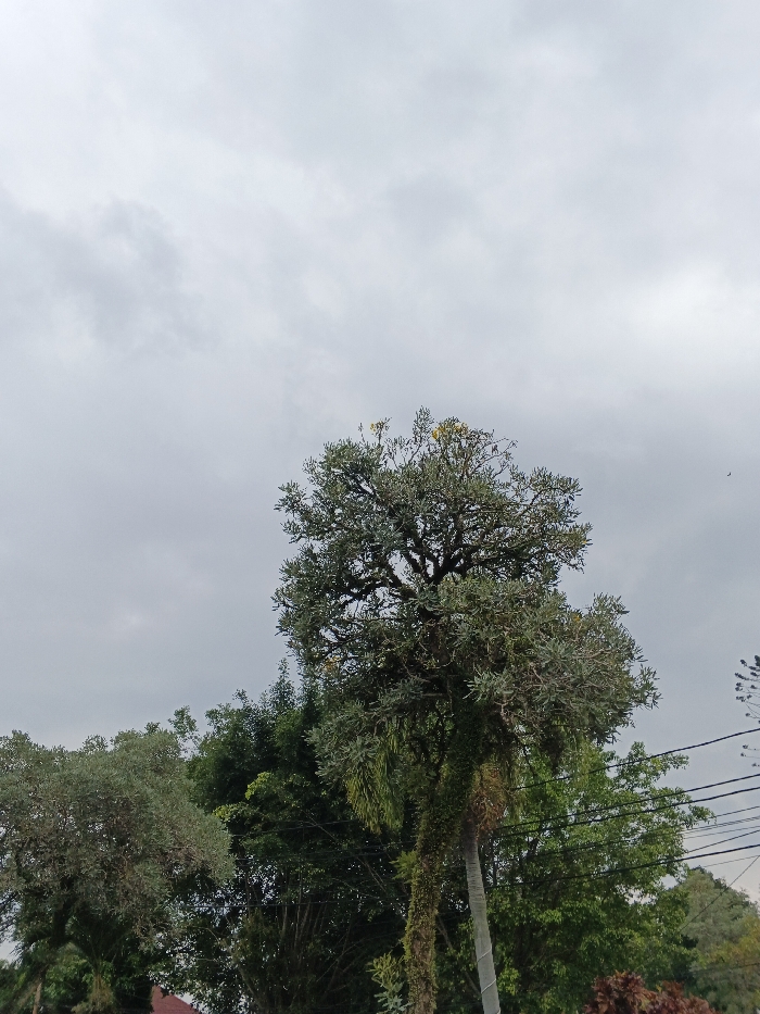 The image depicts a verdant, likely urban or suburban, landscape under an overcast, light grey sky. A large, mature tree with a dense, rounded canopy of green foliage dominates the central frame, exhibiting some lighter green or yellowish accents, possibly small blossoms, near its top. The tree's gnarled branches are partially visible through its leaves, with some areas showing signs of moss or epiphytic growth. To the right and slightly behind this tree, a slender palm-like trunk stands, heavily covered in dark green moss and other climbing plants. Additional layers of diverse green foliage from other trees and bushes are visible in the midground and foreground, with a small patch of reddish-brown foliage present at the bottom right. Two dark electrical wires are strung horizontally across the upper right portion of the frame, intersecting the tree line. A faint, dark, winged object is discernible against the cloudy sky in the upper right quadrant. No individuals are present. The scene is located within a green space in Ho Chi Minh City, Vietnam, though a specific address or district cannot be ascertained from the visual evidence.