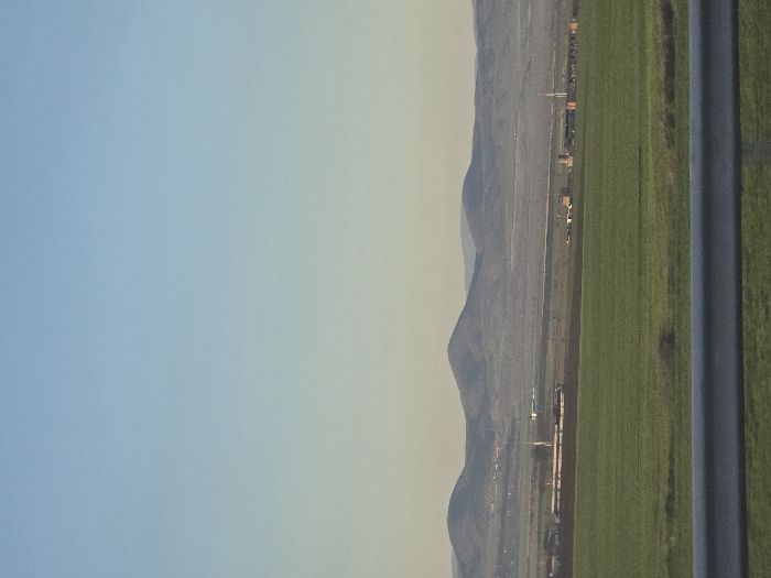 The scene depicts a rural landscape near Polsko Padarevo, Bulgaria, viewed from a slightly elevated position, likely from a road. A grey metal guardrail occupies the lower portion of the frame, running horizontally across the foreground. Beyond the guardrail, a broad expanse of green agricultural field extends into the mid-ground. A small, dark, low-lying shrub is visible within this field towards the lower-left center. Further in the distance, a flat, brownish-grey land strip separates the green field from structures. On the left side of this distant strip, a cluster of industrial or agricultural buildings with light-colored roofs and walls is present, accompanied by a tall, slender white tower or chimney. On the right side of the same strip, another grouping of similar buildings is visible, including at least one prominent tall, thin structure. The background features a range of undulating hills or mountains with varying elevations, their slopes appearing muted green and grey. The sky above is clear, transitioning from a light blue at the zenith to a pale, yellowish-blue haze near the horizon. No individuals or active interactions are discernible. The lighting suggests either early morning or late afternoon.