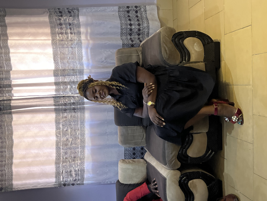 The scene depicts an interior room in Rafin Bauna, Nigeria. An adult female is seated on a multi-toned beige and dark brown sofa. She possesses dark hair with blonde highlights, styled in an updo and secured by a dark patterned head wrap. She is wearing a short-sleeved black collared dress with a tiered skirt, a gold-colored wristwatch on her left wrist, and maroon velvet open-toed high-heeled shoes adorned with a prominent decorative embellishment on the vamp. Her hands are clasped in her lap, and her gaze is directed slightly downwards and to her right. To her immediate left, a portion of another individual is visible, including a dark-skinned hand and an arm covered by a red long-sleeved garment, also seated on the sofa. The background features a window covered by light-colored curtains with horizontal gray patterned bands. The floor is composed of light-colored square tiles.