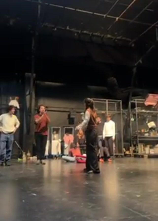 group of young adults, likely students, gathered in what appears to be a theatre rehearsal space