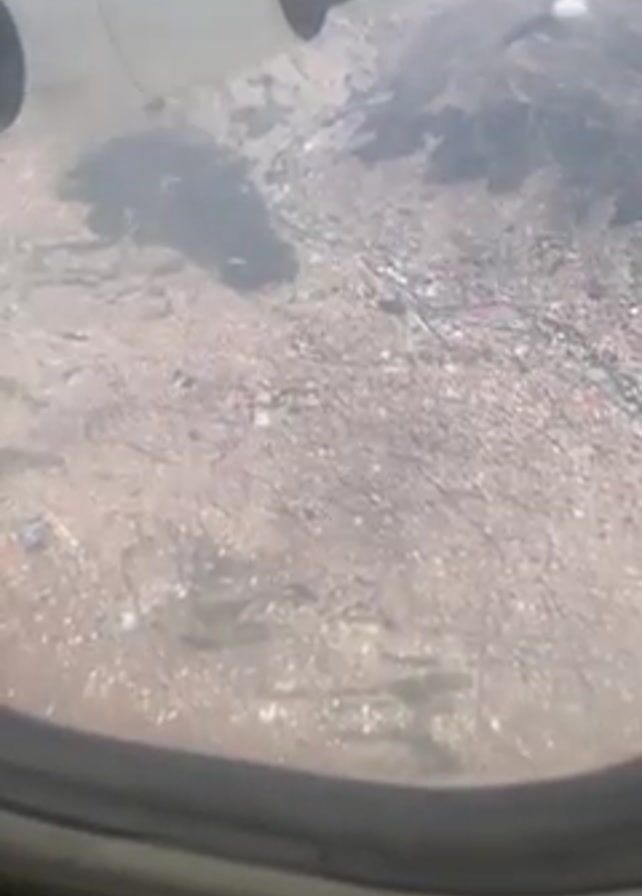 A video shows an aerial view of a city through an airplane window. The city below is densely populated with buildings and roads. The terrain surrounding the city includes hills and mountains. The airplane engine is visible outside the window.