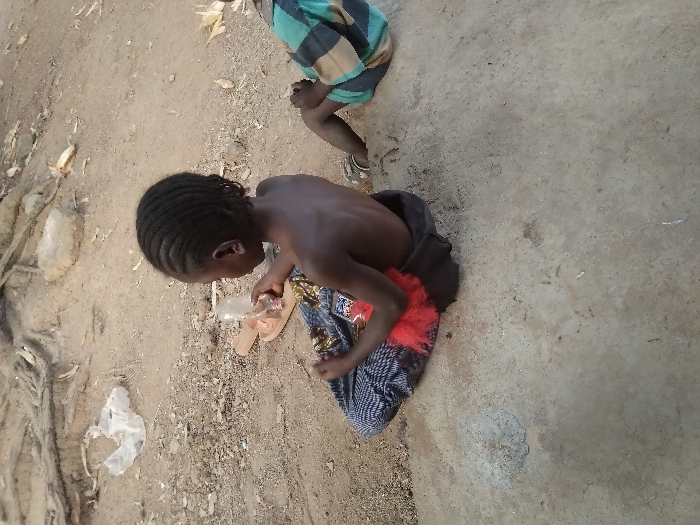 A child with braided hair sits on the ground, topless, with a patterned fabric and red fluff around their waist. They hold a clear plastic bottle. Nearby, a pair of sandals rests on the ground. Another child, wearing a striped shirt, is partially visible above the first child, also sitting. The ground is a mix of dirt, sand, and concrete, with some scattered debris including bits of corn, sticks, and plastic bags.