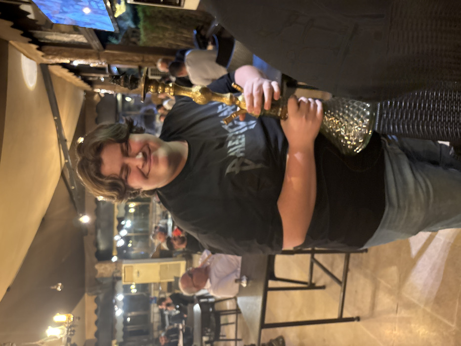 The image portrays an indoor or semi-outdoor cafe setting located in Barza Municipality, Syria, likely at night. The primary subject is a young adult male with medium-length brown hair, a round face, and a smiling expression with eyes partially closed. He is wearing a black short-sleeved t-shirt with stylized text across the chest (appearing to be "BALENCIAGA") and light blue jeans. He holds a golden-colored hookah pipe, featuring a clear, patterned glass base, with both hands to the right of his torso. In the background, several individuals are present, seated at dark tables with accompanying chairs. To the immediate left of the primary subject, an older male with light hair and glasses, dressed in a white collared shirt, is seated at a dark rectangular table, facing away from the camera. A small metallic object rests on his table. Other blurred patrons are visible further back. The environment features a light-colored floor, a suspended canopy or tent-like ceiling structure, and multiple decorative light fixtures, including a chandelier-style element. Wooden architectural accents and a wall-mounted screen are discernible on the right side of the frame. A dark, woven chair back is partially visible in the immediate foreground on the right.