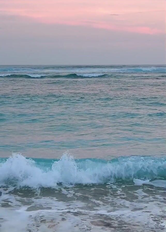 beach scene with teal-colored ocean water meeting the shore. Waves gently roll in, creating white foam as they break on the sand. In the distance, the sky is tinted with a pinkish hue at the horizon, suggesting either sunrise or sunset. There are no people or prominent objects visible, the focus remains on the natural beauty of the ocean and sky.