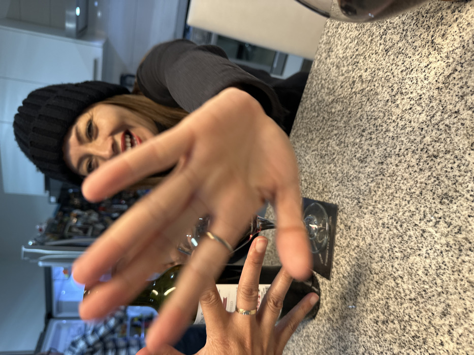 A woman wearing a black beanie smiles with a wine bottle, wine glass, and gray countertop visible. Her hands are outstretched towards the camera, displaying rings on her fingers. In the background, a stainless steel refrigerator is seen along with other kitchen appliances. The woman wears a dark gray or black long-sleeved shirt.