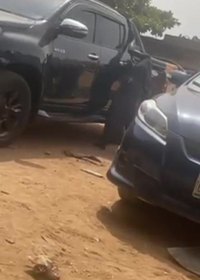 black Toyota Hilux parked on a dirt ground next to a blue sedan, with a person standing in between the two vehicles. The person is wearing dark clothing and sandals and is standing near the front of the blue car. The ground is sandy and there are some small pieces of debris scattered around. There are trees visible in the background.
