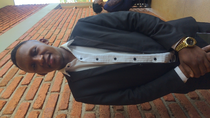 A man wearing a black suit and white shirt stands against a brick wall. He is smiling, with a gold watch on his left wrist. In the background, a blurry figure is visible. The scene is well-lit, capturing the textures of the wall and the man's attire. The photo is taken at an angle.