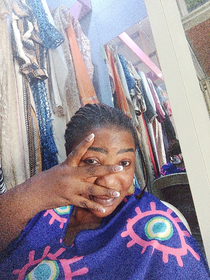 An adult female with medium-dark complexion and dark braided hair is centered in a medium close-up, gazing directly forward with a slight smile. Her right hand is raised, fingers spread, partially obscuring her mouth and nose, with white-tipped fingernails prominent. She wears a dark blue garment patterned with multiple stylized pink "eye" motifs, each featuring light blue and yellow centers. The background to her left shows a densely packed display of various hanging textiles or garments on a wall or rack, exhibiting diverse patterns, textures, and colors including blue, beige, and white. To her right, a large vertical mirror reflects additional hanging garments, a light blue wall section, and a pink horizontal bar. The scene is situated indoors, likely within a retail clothing establishment or a fabric shop. The city of Unknown, Unknown cannot be identified from the visual information provided.