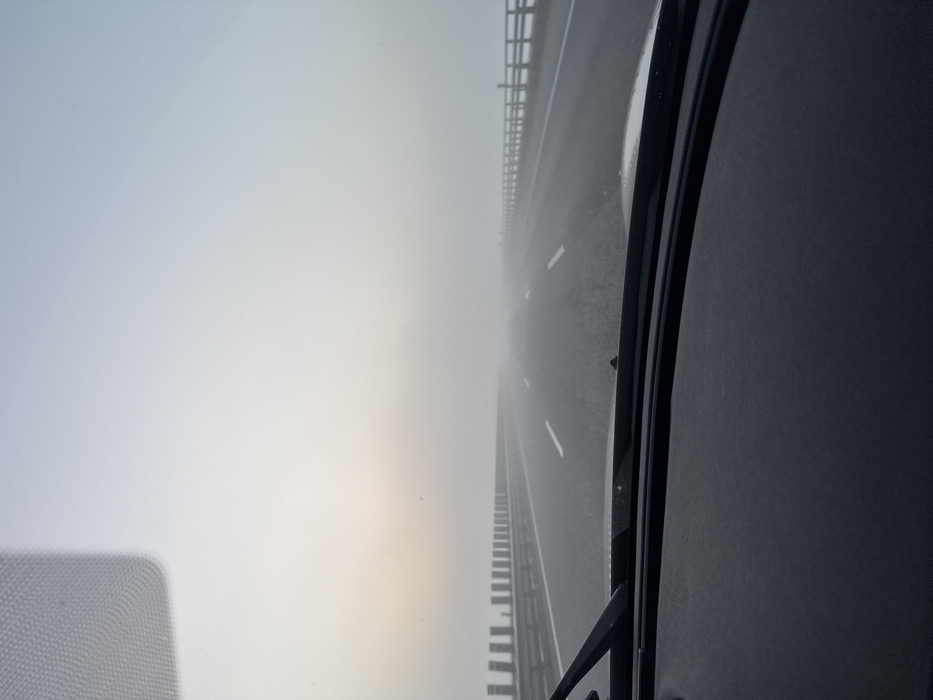 - "A photograph showcases a view from inside a vehicle, possibly a bus, looking out onto a fog-shrouded highway" by FM-6wyrF3, licensed under CC BY 4.0