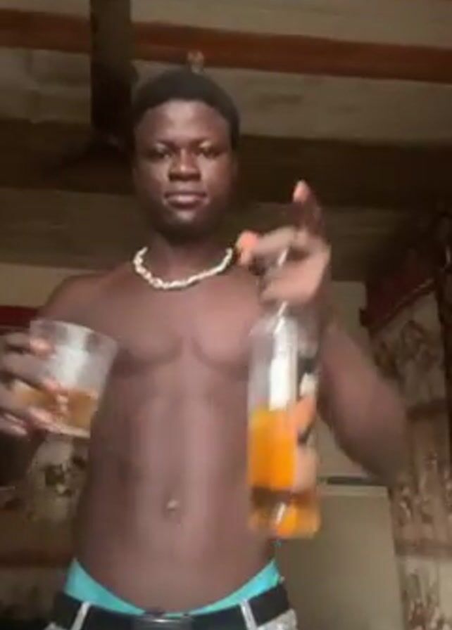 A shirtless, young, Black man stands in what appears to be a room with rustic decor. He wears light blue underwear with grey patterned shorts, a belt, and a white beaded necklace. He holds a glass of amber liquid in his left hand and a bottle, also containing amber liquid, in his right. He drinks from the glass, looking directly at the camera. There's a ceiling fan visible above him, and patterned curtains are behind him.