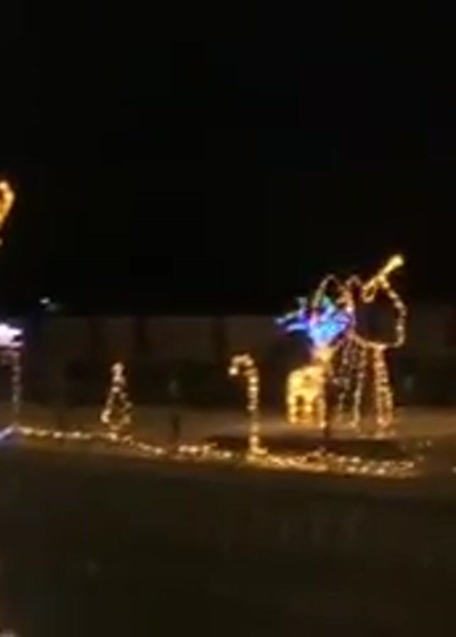 nighttime outdoor display of Christmas lights along what appears to be a street or driveway. There are several lit figures in yellow and white lights, including a nativity scene with what look like angels playing instruments, stylized trees, and a Christmas tree. A string of lights runs along the ground, connecting the figures. A streetlight is visible in the background. A dark fence runs along the bottom of the frame. The video appears to be taken from a moving vehicle.
