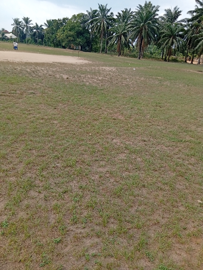 The image depicts an open field or playing ground in Mbak Ikot Abasi, Nigeria, under an overcast sky