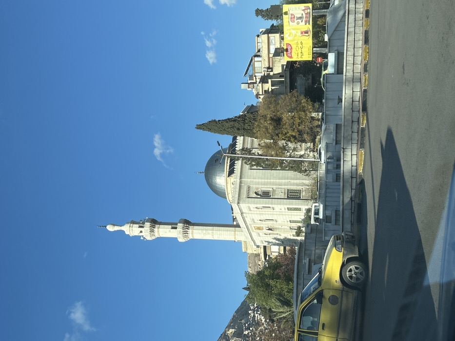 The image captures a daytime urban landscape in Al-Muhajerin Municipality, Syria, under a clear blue sky with sparse white clouds. In the mid-ground, a prominent mosque with a light-colored facade is visible, featuring multiple arched windows with dark grilles, a large dark metallic dome, and a tall, slender minaret with two distinct balcony levels culminating in a pointed finial. To the left of the mosque, a rugged hillside rises, showing sparse vegetation and some structures. In the immediate foreground, the top of a vehicle's dashboard or frame is visible, from which the photograph appears to have been taken. A bright yellow sedan, identified as a taxi, is positioned on the left side of a paved road, facing towards the right. The vehicle exhibits visible dirt and wear on its front quarter panel and wheel. A low concrete barrier with a stacked block design and a yellow curb stripe separates the road from the area around the mosque. To the right of the mosque, multi-story urban buildings with flat roofs are visible, some featuring rooftop installations like solar panels. Several trees, including tall, slender evergreens and deciduous trees with sparse foliage, are scattered throughout the scene. A large yellow billboard with Arabic text and an advertisement for "Romax" tea, displaying a teacup and a tea box, is visible on the far right. Long shadows cast across the road indicate direct sunlight. No individuals are explicitly visible in the scene.