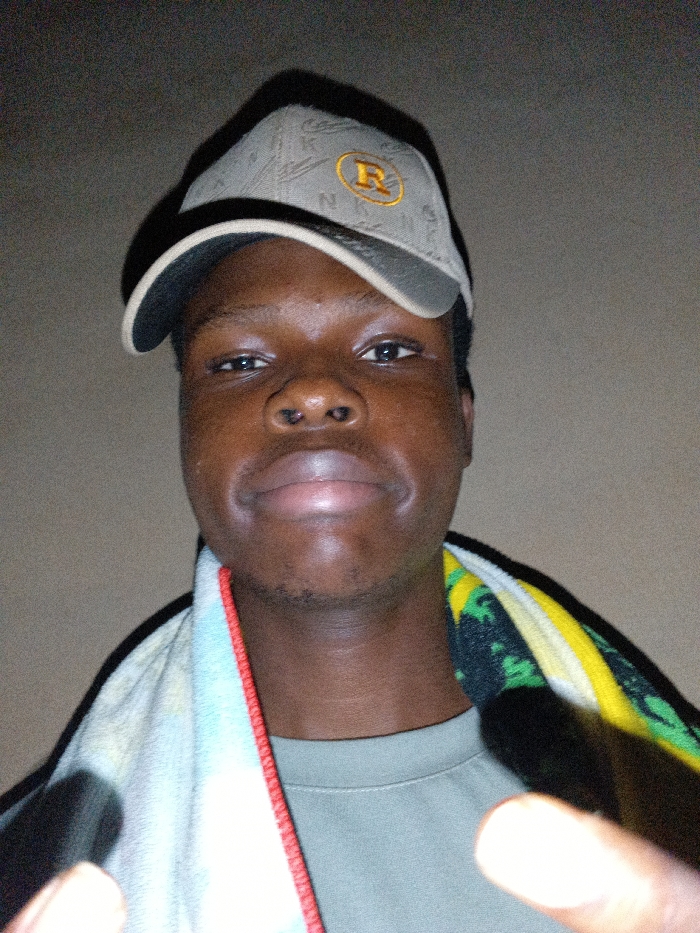 A close-up shot captures a young, dark-skinned man wearing a backwards baseball cap with a yellow "R" logo. He is also wearing a gray t-shirt and a towel with green, yellow, and black stripes draped around his neck. The man's face is front and center with a neutral expression. Two blurry fingers intrude into the bottom corners of the frame, suggesting the photo was taken by the subject. The background is a plain, indistinct wall.