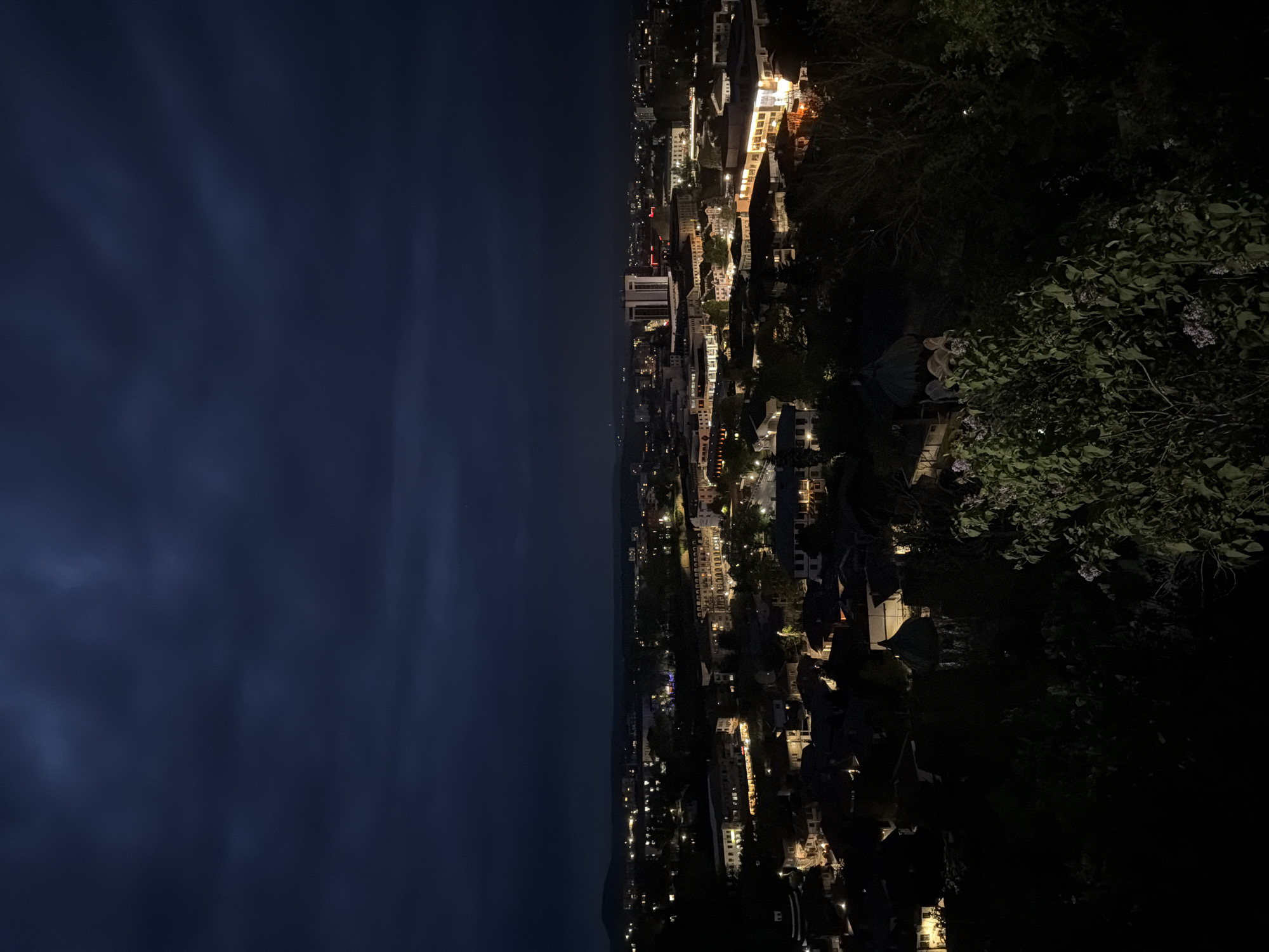 The image depicts a night view of Lovech, Bulgaria, from an elevated vantage point. The left side of the frame is predominantly dark sky, possibly cloudy. The city is illuminated by artificial lights, showcasing building structures and street layouts. Vegetation, including trees and bushes, is visible on the right side of the image. There are no visible people, actions, or interactions evident. The environment suggests a nighttime urban scene.