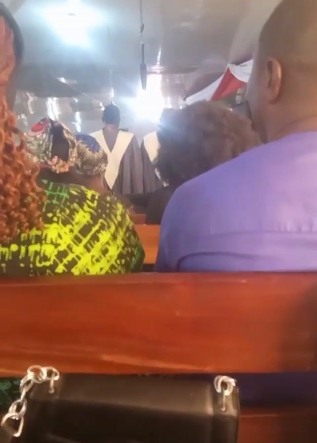 scene inside a church or similar religious building. The perspective is from a pew, looking towards the front. Several people are seated in the pews in front of the camera. A person wearing a robe is standing at the front, possibly a member of the clergy or part of a choir. The lighting is bright and somewhat harsh. A black purse with a chain strap is resting on the pew in front of the camera. A ceiling fan is visible. The audio contains singing.