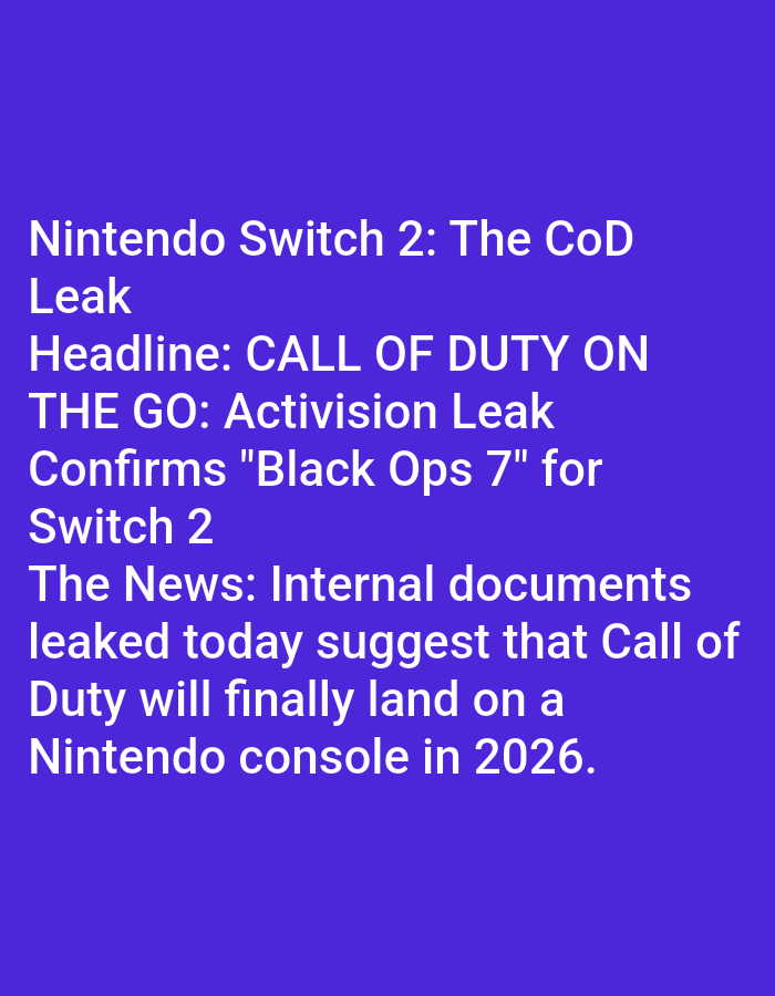 The image features text on a solid purple background. It announces a potential "CoD Leak" related to the Nintendo Switch 2. A headline claims "Call of Duty" will be "On the Go," referencing an Activision leak that supposedly confirms "Black Ops 7" for the Switch 2. The accompanying news states that leaked internal documents suggest Call of Duty will finally appear on a Nintendo console in 2026.
