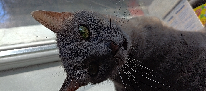A domestic short-haired cat, primarily grey in color, is depicted in a close-up, head-and-shoulders vertical portrait. The cat faces directly towards the viewer, with its prominent green eyes in focus. Natural light enters from the right, illuminating the cat's right side and creating shadow across its left profile. The cat possesses visible white whiskers and pointed ears. In the blurred background, a white window frame is discernible, allowing bright, diffuse ambient light to enter the interior space. A partially obscured object displaying printed text and colorful graphics is visible in the lower right foreground, resting on a surface, likely a windowsill. The scene is located indoors in Odesa, Ukraine.