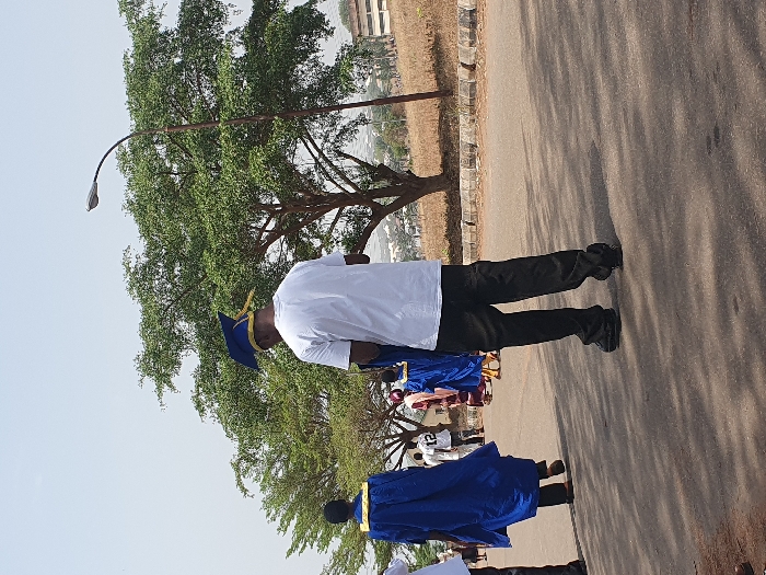 The image captures an outdoor scene on a paved pathway or road within Ogbogbo, Nigeria, under bright, clear daylight. In the immediate foreground, a male figure is observed from behind, attired in a white short-sleeved t-shirt, dark trousers, dark shoes, and a dark blue academic mortarboard featuring a gold tassel. His arms are positioned downwards. To the left and slightly behind, another individual in a full blue academic gown with yellow trim and a dark cap walks away from the viewer. Further back, several other people are visible, including at least two more wearing similar blue academic gowns and one person in a white t-shirt with the number "12" printed on the back. A large tree with dense green foliage stands centrally in the mid-ground, behind the primary subject. On the right side, a curved street light pole with its fixture extends above the tree canopy. A low concrete curb borders the paved surface, separating it from a dry, earthy area. Distant structures are discernible on elevated terrain in the background, partially obscured by atmospheric conditions. The collective attire of multiple individuals suggests an academic ceremonial event.