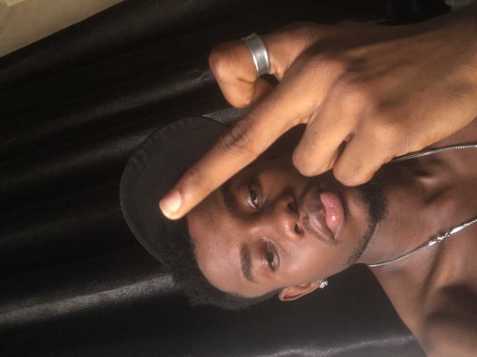 The scene is located in Iranla, Nigeria. The image features a young male individual, positioned from the chest up, directly facing the camera. He has dark skin, short dark hair, and a light beard. He is wearing a black cap, partially visible on his head. A silver-colored stud earring is present in his left earlobe, and a thin, silver-colored chain necklace is visible around his neck. His right hand is raised into the frame, with the middle finger extended vertically, while the other fingers are curled inward. A silver-colored band ring is worn on the ring finger of his right hand. The individual's gaze is directed towards the camera, and his lips are slightly parted. The background consists of dark, vertically pleated fabric, likely curtains.