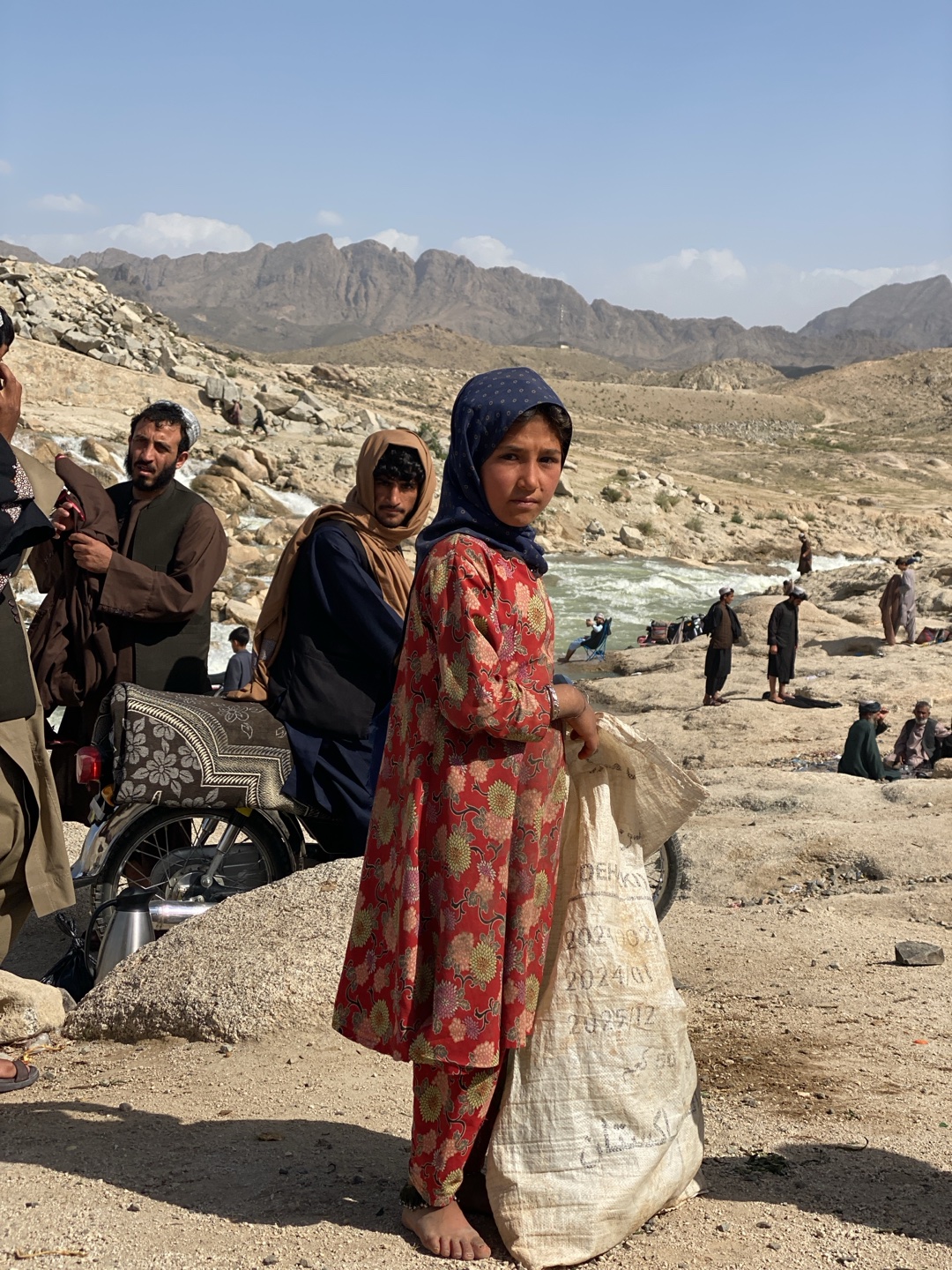 The image depicts a young girl standing in front of a group of people and a motorcycle in a rocky, mountainous landscape. The girl wears a red floral-patterned dress and matching pants, a blue headscarf, and no shoes. She is holding a large sack with faded writing on it. To the left of the girl, a group of men stands near a motorcycle with a patterned seat. Other people are scattered throughout the background, some near a river or stream. The background features a barren landscape with mountains in the distance under a clear, blue sky. The image is set in Kim, Afghanistan.