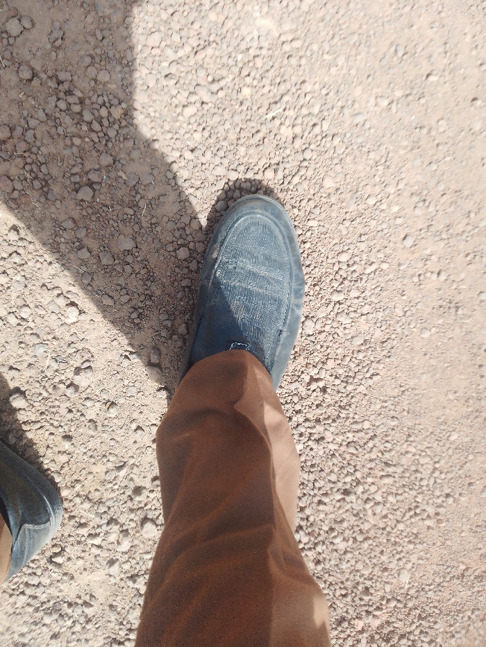 An overhead view captures the lower extremities of an individual standing on a dry, light brown gravel and dirt surface in an unpaved outdoor area within the city of Unknown, Unknown