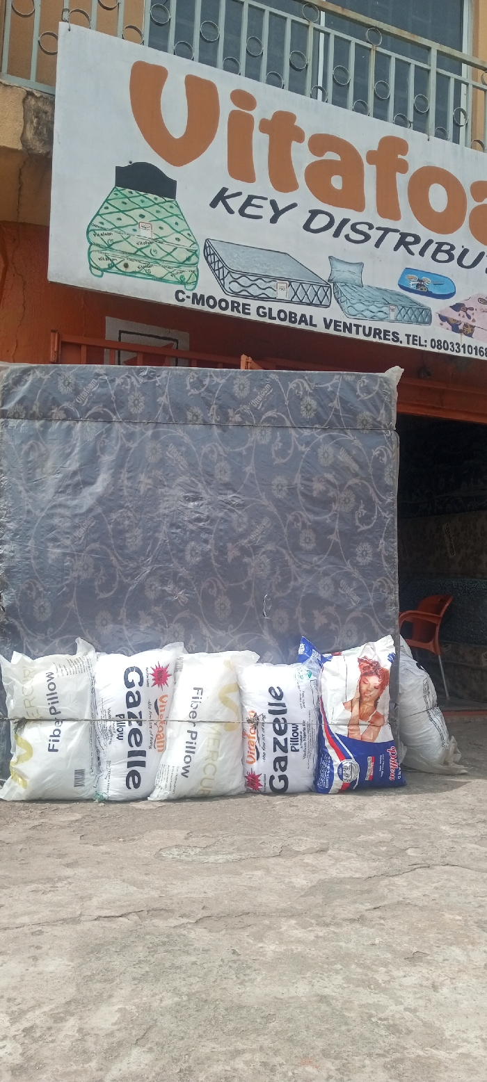 The image displays the exterior of a commercial establishment identified by a prominent sign as "Vitafoam KEY DISTRIBUTORS" and "C-MOORE GLOBAL VENTURES," located in Dadi Riba, Nigeria. The scene is brightly illuminated by natural daylight. In the foreground, an uneven, light grey concrete surface serves as the ground. A horizontal line of approximately six white plastic bags, each appearing to contain a pillow, rests on this surface. Visible labels on these bags include "Fiber Pillow," "Gazelle Pillow," and "Vitafoam," with some bags tied together by a thin cord. To the right of this grouping, a single blue plastic bag, also containing a pillow and featuring an image of a woman, is present, alongside a larger, plain white sack. Immediately behind these items, two mattresses are stacked vertically against the building facade. They are encased in clear plastic wrapping, revealing a dark grey fabric patterned with a lighter floral design. "Vitafoam" branding is discernible on the mattress fabric. Above the stacked mattresses, a large rectangular white sign is affixed to an orange-brown painted building. The sign features "Vitafoam KEY DISTRIBUTORS" in large orange letters and "C-MOORE GLOBAL VENTURES. TEL: 080331016" in black text, along with hand-drawn illustrations of mattresses and pillows. An open doorway or entrance to the right of the stacked mattresses reveals a shadowed interior where an orange plastic chair and other merchandise are faintly visible. Above the sign, a dark metal railing with circular motifs is attached to the upper section of the building facade. No individuals are present in the frame.