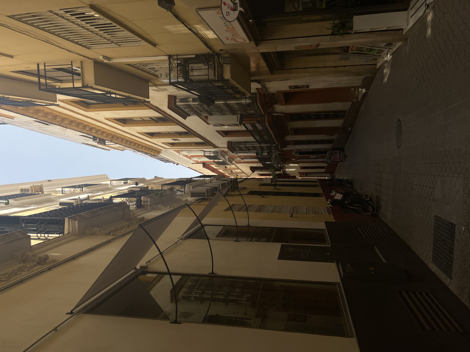 A narrow street view angled upwards shows buildings on both sides, featuring a mix of architectural styles with visible windows, balconies, and air conditioning units