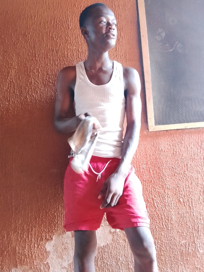 A young male individual stands in an upright posture, slightly left of the image's vertical center, against a textured, orange-brown wall. He has short, dark hair and a dark complexion. He is dressed in a white ribbed tank top and red shorts, which feature a visible white drawstring. His head is turned towards the upper right of the frame, with his gaze directed off-camera in that direction. His right arm is bent, and he holds a crumpled, light-colored fabric item, which appears to have a plaid or striped pattern. His left arm is relaxed at his side. A portion of a rectangular window, framed with light-colored wood and fitted with a dark mesh screen, is visible in the upper right background. The scene is located in Agbor, Nigeria.