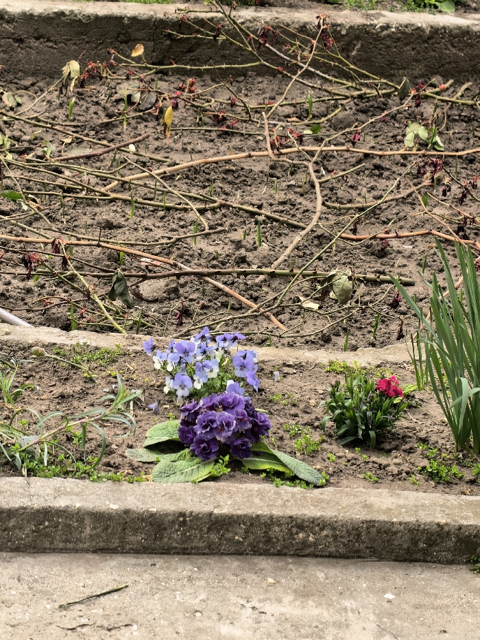 The scene depicts a tiered outdoor garden area in Topoli, Bulgaria, viewed from a slightly elevated perspective. In the immediate foreground, a weathered concrete step or retaining wall runs horizontally across the lower third of the frame. Immediately behind this concrete barrier, on dark, moist soil, a cluster of deep purple flowers with green leaves is observed lying flat. To the left of this cluster, a group of smaller blue and white flowers with yellow centers grows upright from the soil. To the right, a plant with dark green foliage and a single red bloom is visible, next to taller, blade-like green plants on the far right. The soil in this section is dark, with minimal small green vegetation and sparse weeds. Above the lower garden bed, a second concrete step or retaining wall horizontally bisects the image. Beyond this, an upper planting bed of dark, disturbed soil extends upwards. This bed is covered with numerous bare, thin, woody branches and twigs, some exhibiting small red remnants or dried leaves. Small green shoots are observed emerging from the soil at various points among the branches. A third, partially visible concrete structure forms the background at the top of the frame, with indistinct green foliage visible above it. No human subjects, animals, or active interactions are present in the image.