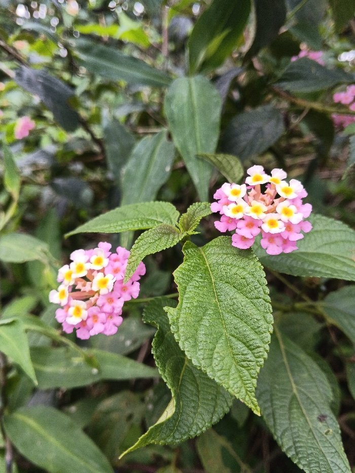 - "A close-up photograph displays two clusters of Lantana camara flowers amidst green foliage" by FM-QlAdj2, licensed under CC BY 4.0