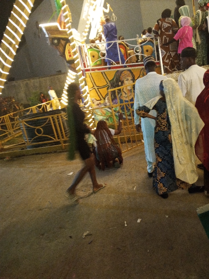 Several people are gathered near a carnival ride at night. The ride is lit with bright white lights. A woman in a black dress walks past the scene. Another woman is kneeling, potentially praying. A man in a light blue suit and a woman in a blue patterned dress and white head covering stand nearby. The overall atmosphere suggests a festive event.