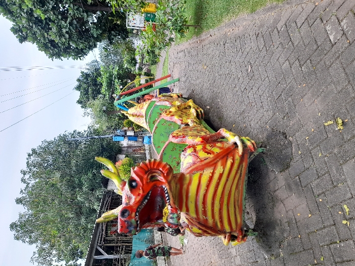children's playground in Kecamatan Sidoarjo, Indonesia (latitude: -7.441, longitude: 112.705). The main subject is a large, colorful dragon-shaped ride made of metal and painted with yellow and red stripes. The dragon is positioned on a paved surface made of interlocking bricks. There are several children playing on the dragon ride. Two are sitting on the back of the dragon, and one is standing at the front, facing the camera. The dragon is facing the left side of the image, and the rest of the ride is visible behind it. The ground is covered in gray brick pavers. There are green trees and bushes in the background. A blue utility pole is visible at the far left. The image was taken on a clear day with a bright sky. The sky is visible between the trees and power lines. The image was taken from a low angle, looking up at the ride.