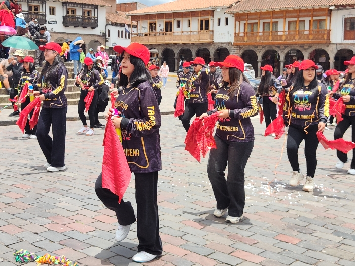 A group of young women in a plaza are dressed in matching outfits: red baseball caps, black tops with gold text reading "TRADICIONAL ALMUDENA," and black pants. They are holding red handkerchiefs and appear to be dancing or performing a traditional dance. The plaza is made of cobblestone, and in the background, there are buildings with balconies and arches. Other people are visible in the distance, some holding umbrellas.