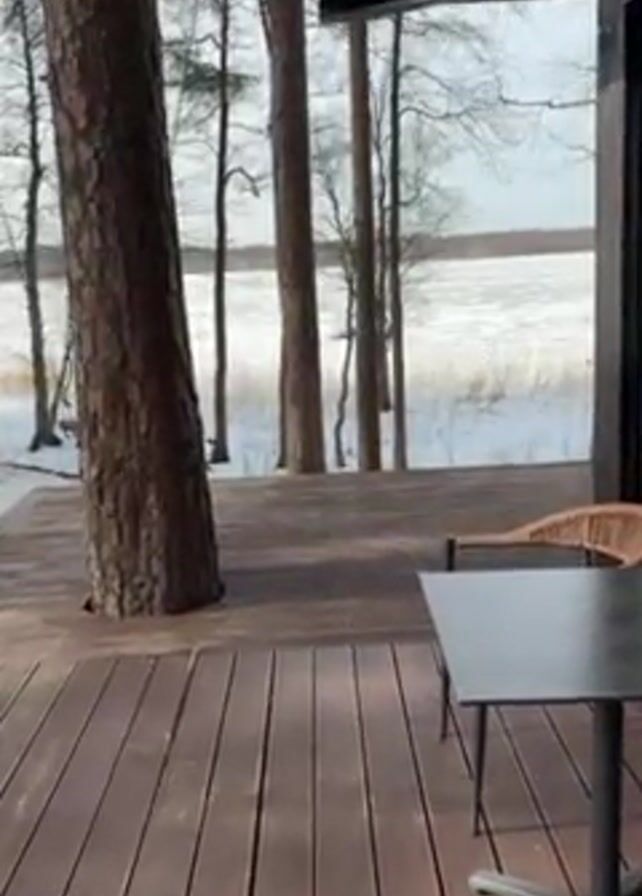 The video presents a view from a wooden deck, possibly attached to a building, towards a snow-covered landscape. Tall trees stand between the deck and the snowy expanse, which could be a field or frozen lake. A small table and chairs are visible on the deck. The weather appears to be overcast. There is no indication of people or activity in the shot, only the static view of the wintery scene.