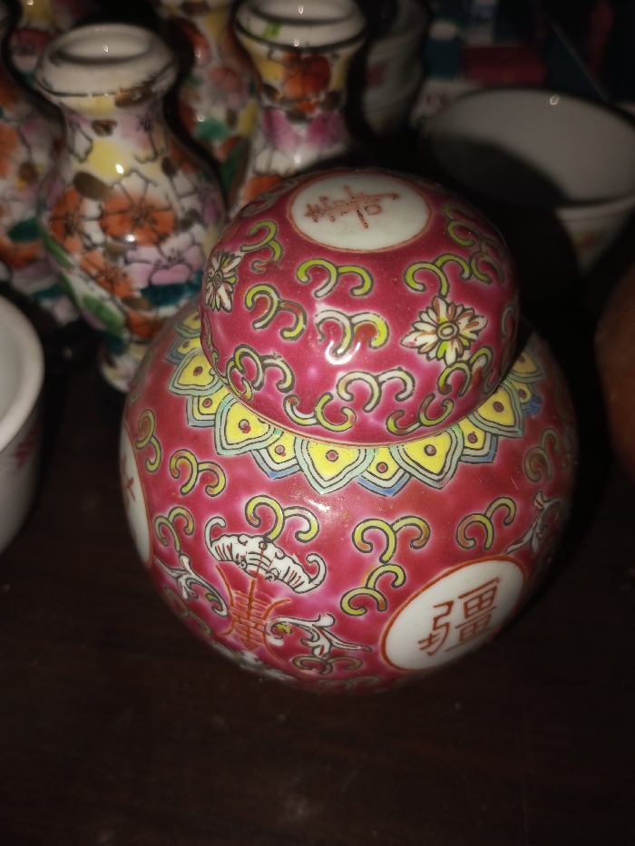 A red, round Chinese ginger jar with a lid sits on a dark surface. The lid features flowers and swirling patterns in yellow and green. The jar itself has similar designs with yellow and light blue accents. Chinese characters are painted in white circles on the jar's surface. Additional miniature, colorful vases are present in the background along with a white teacup.