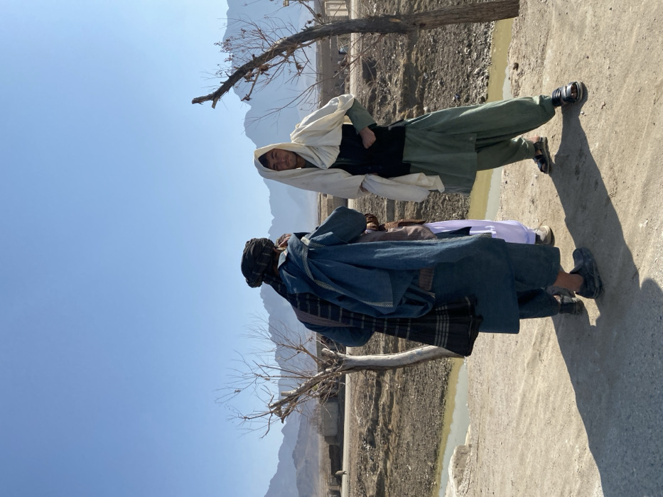 Two men are standing on a concrete surface next to a body of water. The man in the foreground wears a blue robe with a plaid shawl draped over his shoulder, and a black head covering. The second man wears a white head covering, a dark vest, and green pants. A bare tree branch is visible on either side of the men. Mountains are visible in the background under a clear blue sky.
