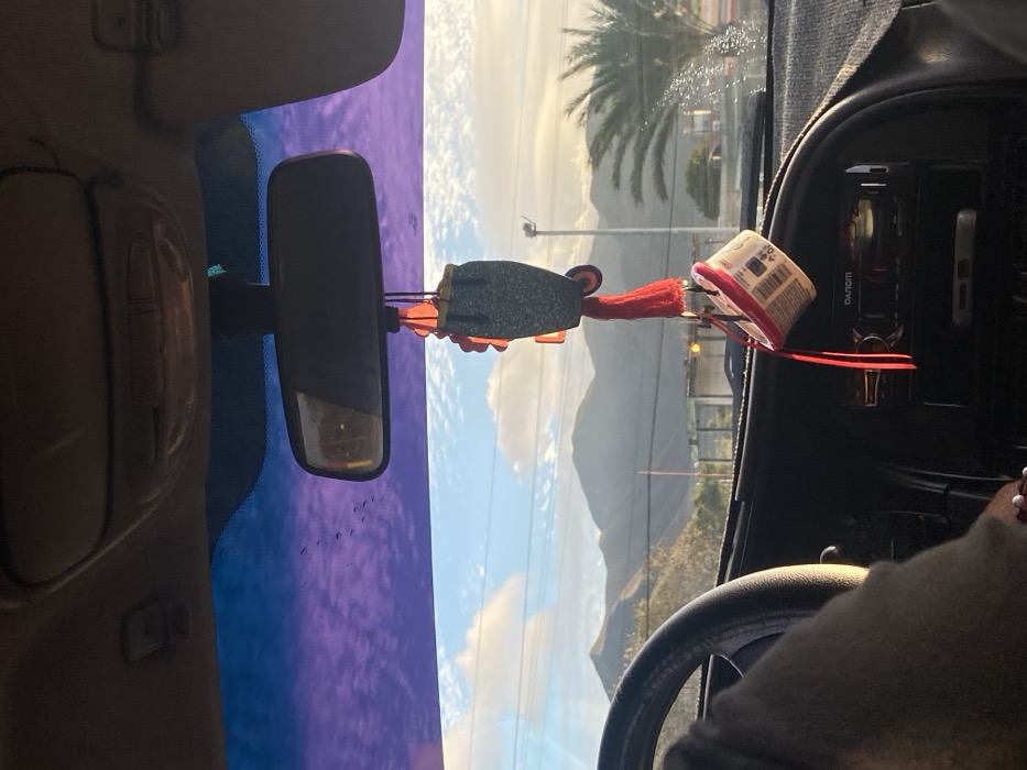 The scene is captured from inside a vehicle, looking forward through the windshield. A person's left hand, adorned with red and white beads, grips a dark steering wheel in the lower-left quadrant. The vehicle's dark dashboard is visible, featuring a "DANOM" branded audio unit in the center console. A rectangular rearview mirror is mounted centrally, from which a decorative assembly hangs. This assembly includes a dark gray, textured, flat object, red tassels, and a small, white cylindrical container, possibly a yogurt cup with a visible label, hanging inverted. The top portion of the windshield displays a purple-blue tint with small dark specks. Outside the vehicle, a landscape bathed in daylight is visible. Horizontal utility lines cross the midground. To the left, the lower slopes of a mountain range are covered with arid vegetation. To the right, a tall utility pole stands near a prominent palm tree, with a visible water spray in front of it. Faint structures are discernible in the distance. The background is dominated by an expansive range of arid mountains under a partly cloudy blue sky. A yellow traffic light is visible in the mid-distance. The setting is El Dátil, Venezuela.