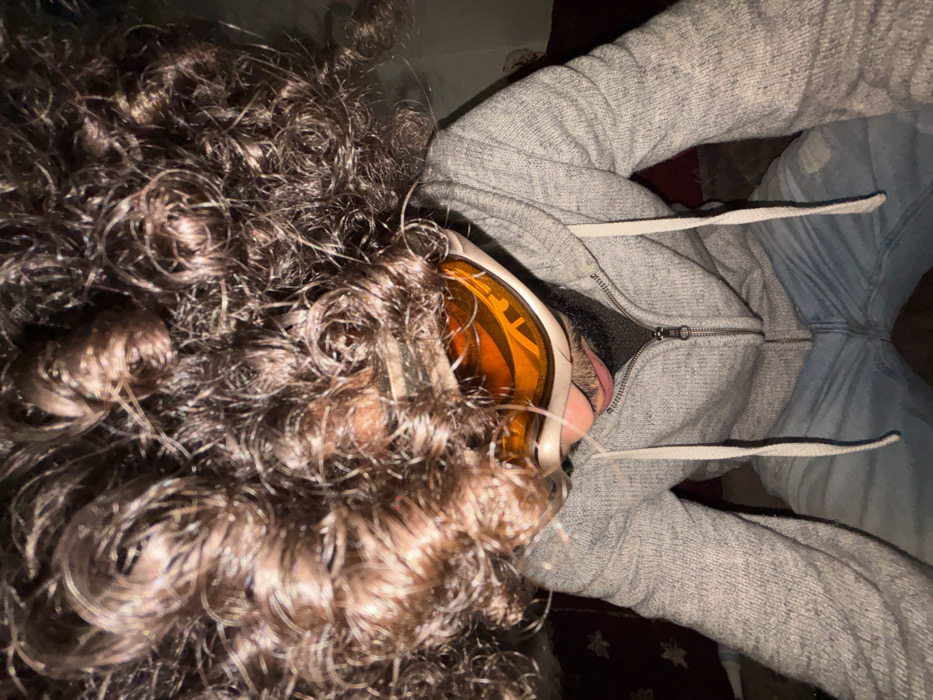 The scene depicts a single individual in the city of Tanger, Morocco. The person is positioned with their head tilted downwards, obscuring direct facial visibility. They have dark, curly, and voluminous hair that extends upwards and outwards. A pair of white or light-colored ski goggles with an orange, reflective lens are worn over the eyes. Below the goggles, a dark beard or stubble and the upper lip are visible. The individual is wearing a light grey, zippered hooded sweatshirt with visible white drawstrings and light blue denim jeans. The background is an indoor, dimly lit environment, featuring dark fabric with light, stylized patterns to the left and a plain dark red surface to the right. No discernible actions or interactions are taking place beyond the static pose.