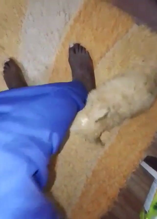 person standing on a rug, wearing blue pants. A small, light brown, curly-haired dog is interacting with the person's leg, possibly nipping or nudging at it. The rug is multicolored with stripes of beige, white, and orange. The floor is visible in the background and appears to be made of wood. The video seems to be shot from a first-person perspective, looking down.