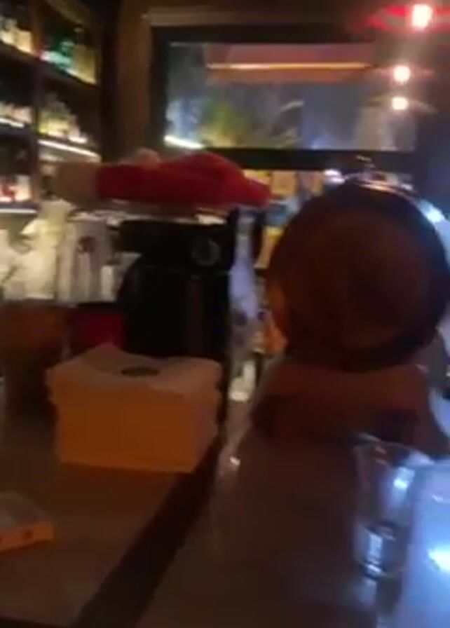 dimly lit bar. At the bar are a stack of napkins, a coffee maker with a Santa hat on top, and a shelf full of liquor bottles. There are people sitting at the bar drinking, and a television on the wall. The overall ambiance appears to be a bar.